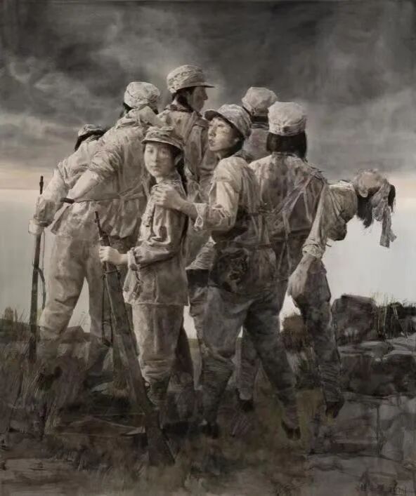 《乌斯浑河岸》以透明水彩作为媒介进行绘制,主题为东北抗联时期“八女投江”这一历史事件。创作意在展现八名女战士为抗战胜利献出宝贵生命的英雄壮举和民族气节,不仅是对“八女投江”这一历史事件的追忆和祭奠,更是践行习近平总书记在文艺工作座谈会上的重要讲话精神,体现出东北抗联精神在新时期是引领青年积极奋斗的一面旗帜,是振兴东北老工业基地的发展动力,是实现中华民族伟大复兴的精神力量。