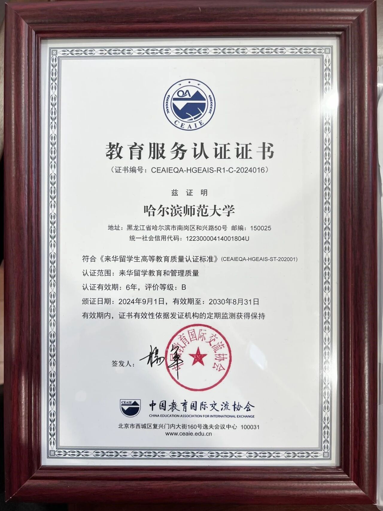 10月31日,由中国教育国际交流协会主办的“重塑升级、多元发展——面向未来的来华留学教育对话”在北京国家会议中心举行。会上公布了31所2024年度通过来华留学生高等教育质量认证和再认证的高校名单。我校顺利通过来华留学生高等教育质量认证(再认证),获得六年认证有效期。国际教育学院院长张晓涛代表学校参加颁证仪式。