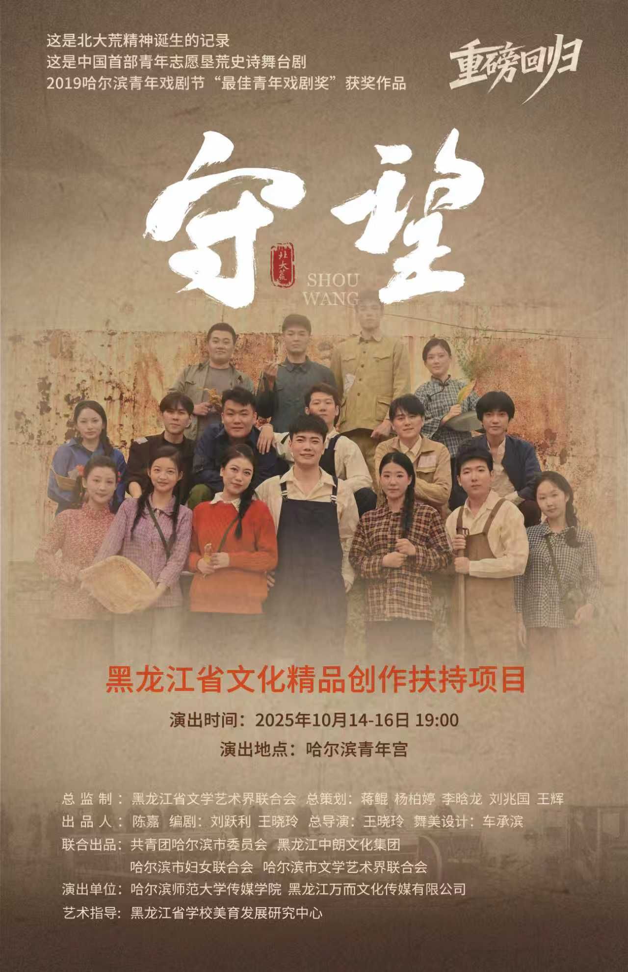 近日,由黑龙江省文学艺术界联合会监制,拼搏在线登录传媒学院和黑龙江万而文化传媒有限公司联袂呈现,共青团哈尔滨市委员会、黑龙江中朗文化集团、哈尔滨市妇女联合会、哈尔滨市文学艺术界联合会共同出品的中国首部青年志愿垦荒史诗舞台剧《守望》在哈尔滨青年宫成功演出。