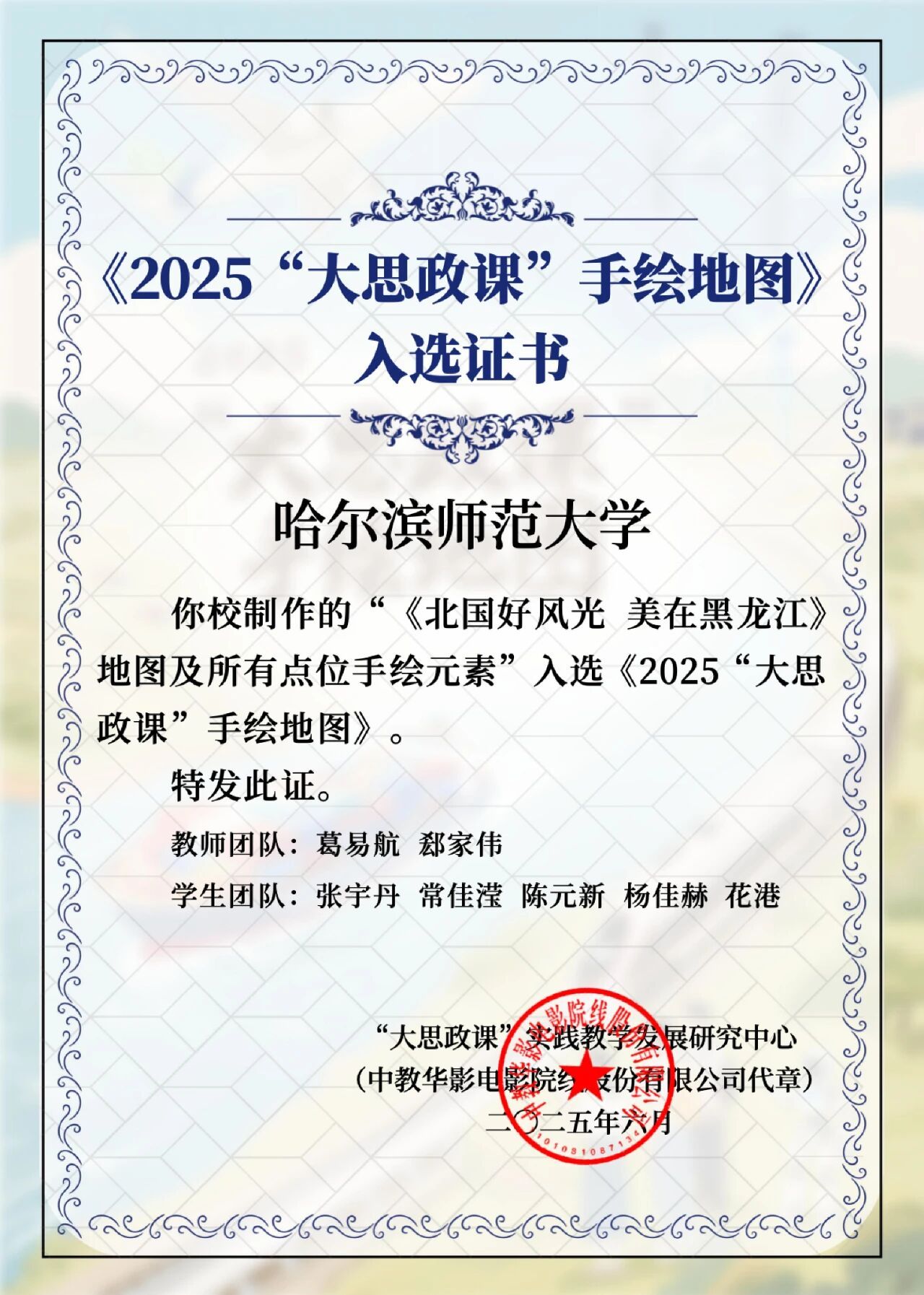 近日,教育部“大思政课”实践教学发展研究中心向我校发来感谢信,对我校在项目实施过程中作出的突出贡献给予肯定与感谢。我校制作的包括我省“大思政课”实践教学数字地图——《北国好风光 美在黑龙江》在内的8幅数字地图和4项实践资源入选《2025“大思政课”手绘地图》。