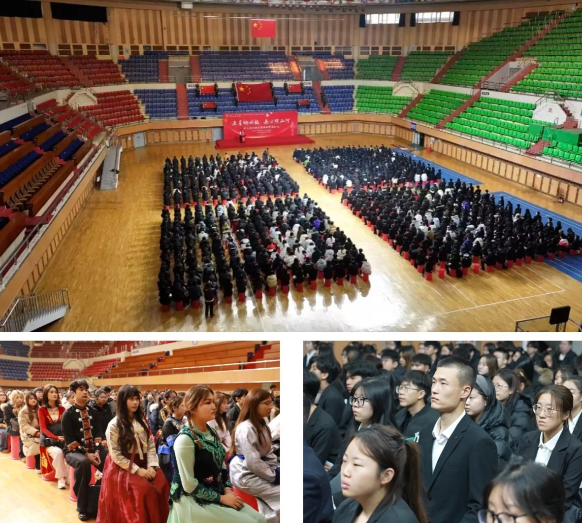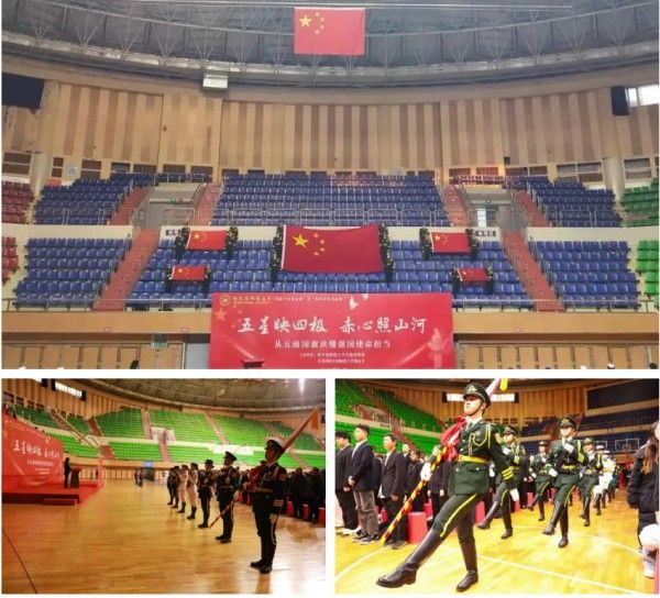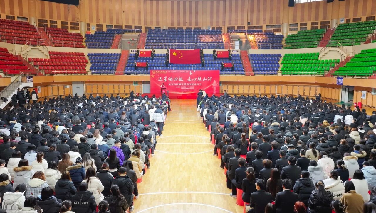 2025年11月12日,学校在体育馆内举行“五星映四极,赤心照山河——从五面国旗读懂强国使命担当”主题升旗仪式暨“国旗下的思政课·场馆里的思政课”。校党委副书记、工会主席郭砾,党委常委、宣传部(党委教师工作部)部长张艳君,党委常委、组织部部长王羽,学生工作部(学生处、武装部)、校团委、学生就业指导处等相关职能部门负责人,各学院党委副书记、辅导员及千余名学生共同参与,沉浸式聆听这场铸魂润心、励志笃行的思政大课。仪式由校团委书记刘春玲主持。