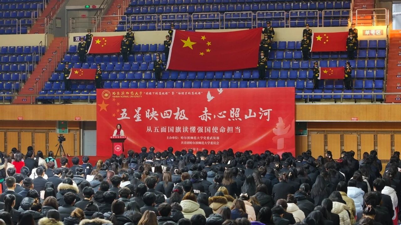郭砾以《集五方之帜 铸信仰之基——来自祖国“四极一心”的力量》为题,讲授了一堂深刻生动的“国旗下的思政课·场馆里的思政课”。她表示,五面国旗串联祖国四极与心脏,凝聚着边疆卫士的赤诚与全国人民的同心伟力,每一面都镌刻着忠诚与坚守,也承载着哈师大学子扎根边疆、报效祖国的赤诚担当。从北极寒疆的坚毅守望,到东极哨所的青春蜕变;从南海礁盘的寸土不让,到西陲大地的深深扎根,再到天安门广场国旗承载的国家嘱托,每一段故事都回答着“强国建设,青年何为?”的时代命题。更加坚定了哈师大学子“身在最北方,心向党中央”的政治忠诚。全体师生备受鼓舞、热血沸腾,掌声经久不息。