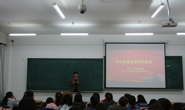 交流会分为交流分享和求职培训两个部分。交流分享中学院邀请了2011级中签约伊春一中刘岩、天津北辰区教育局王茂臻、广西柳州铁一中顾聪涵和考上湖南省洪江市国税局曾纯等四名同学从省内重点中学面试招聘、省外教育局面试招聘、公务员国考和省外重点中学招聘等角度,以自身的实际经历出发,讲述了他们在求职过程中的宝贵经验和心路历程,从公务员招考到面试教师等多个方面展示了师范生就业岗位应聘的基本技能。求职培训部分由学院副书记李贵彬主讲,他从2015届学生就业情况介绍、就业信息的搜集方法、个人应聘材料的准备、面试和招考的准备、择业注意事项等五个方面给学生做了全面、细致的讲解,提出了心态平和、定位准确、积极寻找和坚守诚信等要求。