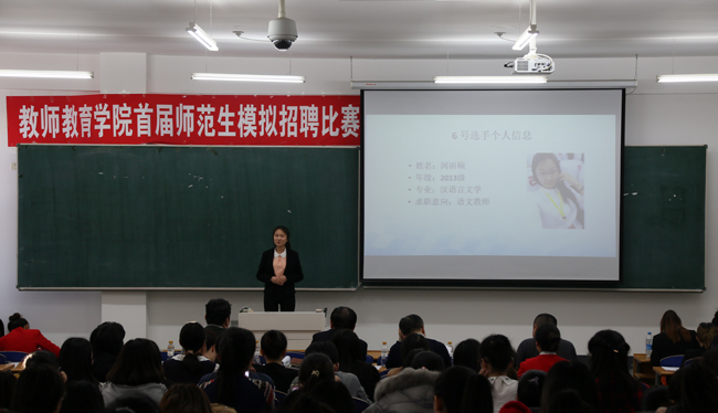 (孙爽/文)为了让学生了解招聘流程及事项,增加求职信心和竞争力。教师教育学院特举办首届师范生模拟招聘比赛,决赛于12月16日下午在崇师楼进行,学校学生就业指导处处长张旭东、副处长韩方立,教师教育学院院长王永成、党委副书记李贵彬担任评委,2013级拟找工作同学及14、15级学生200余人参加活动。