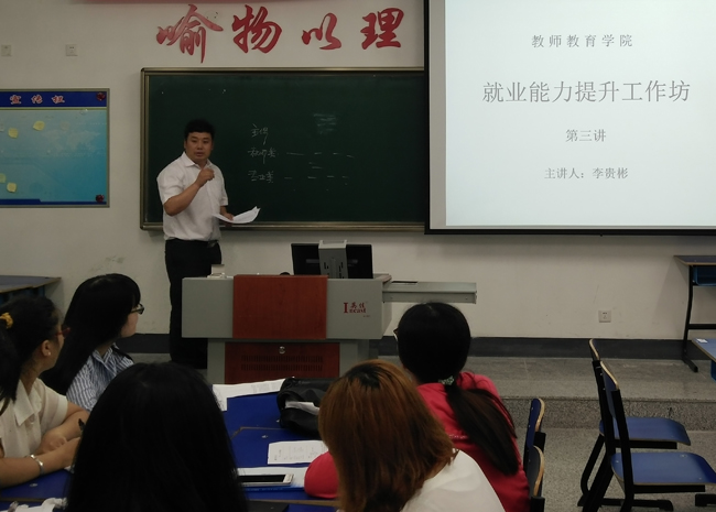 (刘艳伟/文)为了提升学生的就业能力,做好毕业应对招聘和竞争的各项准备。教师教育学院从今年5月下旬开始举办了就业能力提升主题工作坊,学院2013级毕业意向为就业的110名学生参加工作坊,历时一个月,共分为三个班,学院党委副书记李贵彬及辅导员老师担任工作坊的主讲教师。
