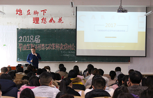 (陈莹莹/文)为积极落实高校毕业生就业政策,将《拼搏在线登录大学生思想政治教育“112349”工作模式实施方案》落实到实处,扎实做好毕业关键阶段的就业服务工作,帮助2018届毕业生更好地掌握就业政策、找准就业定位、明确就业方向并解决就业过程中遇到的问题,地理科学学院于2017年11月29日下午在理工三号楼220教室召开2018届毕业生就业形势与政策解读培训会。此次会议由学生就业指导处处长张旭东教授主讲。学院党委副书记出席本次会议。2018届毕业生参加本次会议。