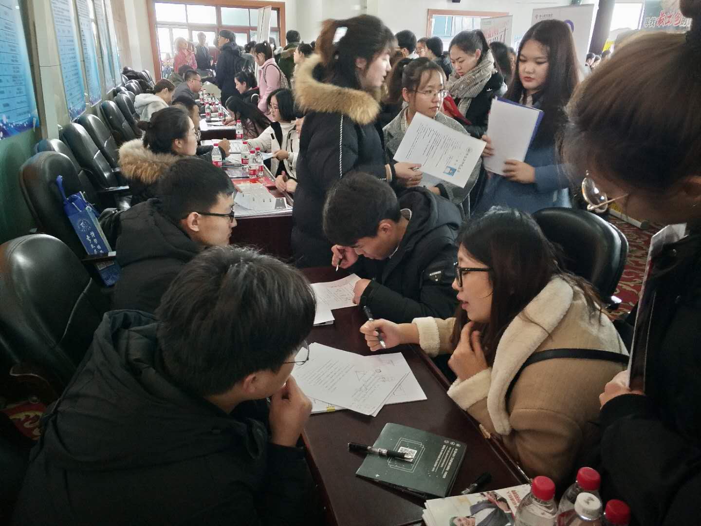 虽然只是中型招聘会,但前来应聘的毕业生却络绎不绝,许多招聘单位前挤满了前来应聘的同学们,他们手持自己精心准备的自荐书和简历,积极与招聘人员交流,在面对面的沟通中了解招聘单位的情况和岗位要求,进行初步岗位筛选。一些非毕业班的师大学子也来到招聘会现场,了解目前就业形势以及社会需要,亲身感受洽谈会现场氛围。
