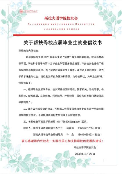斯拉夫语学院校友会向海内外校友发出“关于帮扶母校应届毕业生就业倡议书”,希望发挥自身优势、挖掘资源,并根据毕业生专业特点,向母校毕业生提供招聘信息、就业岗位,为母校解忧,为毕业生解难。