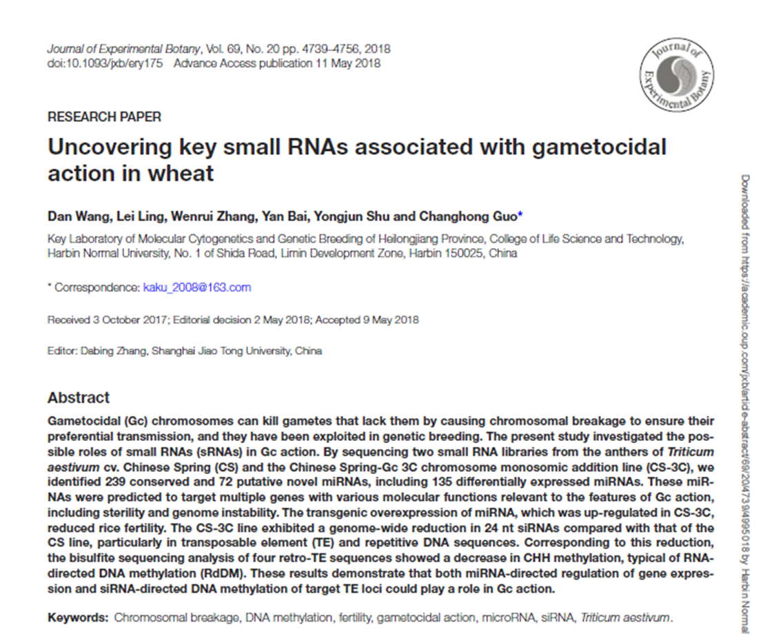 Uncovering key small RNAs associated with gametocidal action in wheat |