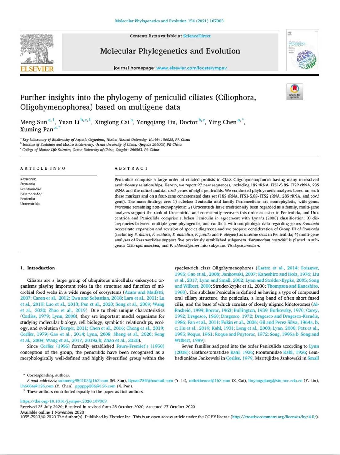 Further insights into the phylogeny of peniculid ciliates(Ciliophora,Oligohymenophorea)based on multigene data |
