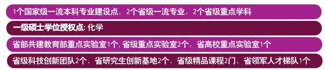 学院现有“双万工程”国家级一流本科专业建设点1个(化学专业,2020),省级一流本科专业建设点2个(制药工程专业,2021;材料化学,2021),1个省级重点专业(化学专业),2个省级重点学科(化学一级学科、物理化学学科)、1个省部共建教育部重点实验室、2个省重点实验室、1个省高校重点实验室、2个省级科技创新团队、2个省研究生创新基地、2门省级精品课程、2项省虚拟仿真实验教学项目和2个校企合作研究中心。2018年化学和材料科学分别进入ESI全球前1%,在软科世界学科排名中学院材料科学与工程进入世界500强行列。