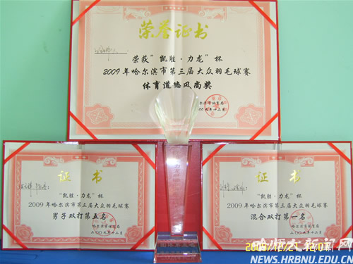 近日,在校工会的支持与组织下,我校教工羽协参加了由哈尔滨市体育局主办的2009年哈尔滨市第三届大众羽毛球赛。每年,此项羽毛球比赛都是哈尔滨市水平最高、竞争最激烈的一项比赛,汇集了各区县所有高水平的羽毛球俱乐部及企事业单位的羽毛球队伍,组建仅一年的我校教工羽协在本次比赛中获得了可喜的成绩。