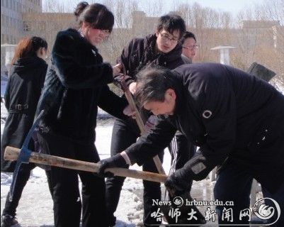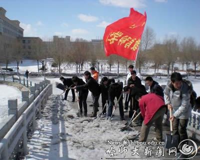 由于连日来的昼夜温差较大,我校松北校区梦溪桥的积雪融化后又凝结成厚厚的坚冰,这为师生出行带来了极大不便并威胁着老教师们的人身安全。鉴于此种情况,3月24日中午,物理与电子工程学院有关领导带领九名教师,牺牲午休时间,自发组织义务清扫梦溪桥积雪和坚冰。3月25日上午,教育科学学院积极响应学生工作处号召,组织本院义工队伍对梦溪桥桥面的积雪以及冻冰进一步清扫。
