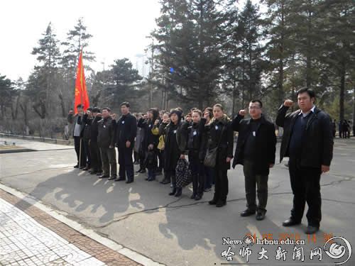 参与扫墓的全体人员穿戴整齐,胸戴白花,从校园出发,怀着对烈士无限崇敬的心情步行来到哈尔滨市革命烈士陵园。党员代表向烈士墓敬献花圈,全体人员向革命烈士三鞠躬,默哀一分钟,寄托大家对先烈的沉痛哀思。