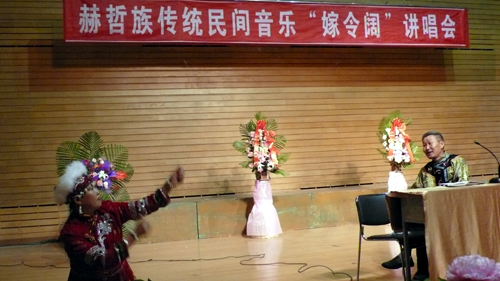 “嫁令阔”是赫哲语唱歌的意思,专指流传下来的民间歌曲。其特征是:符合以传统民歌为基调——不离开传统固定曲调的形式;演唱者即兴填词,旋律特征明显;用本民族语言表现和反映赫哲族民情与风俗的创作歌曲。它不同于“伊玛堪”,也有别于赫哲族的“萨满歌曲”。傅占祥精彩的讲唱和准确的翻译,将这种古老艺术形式完美的呈现在大家面前。他不仅掌握大量的赫哲族传统嫁令阔,更是经常亲自参与创作,因此他对这种艺术形式也有着更为深入的理解。尤俊丽不仅是赫哲族嫁令阔的传承人,更对赫哲族传统舞蹈情有独钟,她为大家带来了传统舞蹈,那充满激情舞姿,将赫哲族的生产生活动作与舞台表演完美的融合在一起,引起学生们的阵阵掌声。