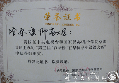 在刚刚结束的第三届“汉语桥”在华留学生汉语大赛中,我校荣获大赛组织奖,我校奥地利留学生高海、韩国留学生金鸿周获决赛鼓励奖。