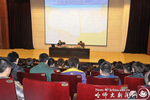 报告会上,徐德荣教授紧紧围绕当前利比亚动乱的热点问题,分别从历史、政治和战略的高度对利比亚国内局势以及国际社会相关动态进行分析讲解,旁征博引,同时辅以大量的图片,报告内容丰富,讲解风趣幽默,引发学生对于当前时政的关注和深思。报告会的最后,宋佳东对报告进行总结并提出期望,希望广大学生要努力提高政治敏感性,树立正确的世界观,勤奋学习,自强不息,勇于担当,为祖国的建设贡献力量。