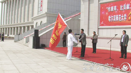 图2 党委副书记王广明为校庆志愿者服务团授旗