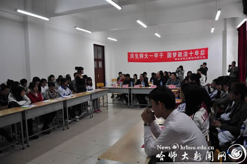 (100工作室记者郑杰/文)4月27日下午,政法学院在社科楼505教室举行了“庆生师大一甲子 圆梦政法十年后”座谈会。学生工作处、团委、政法学院部分教师和学生代表、校学生团工委、各学院学生团工委代表参加了座谈会。