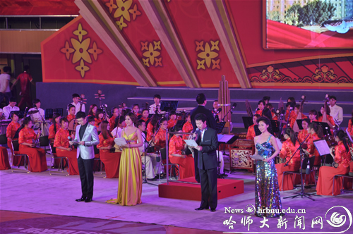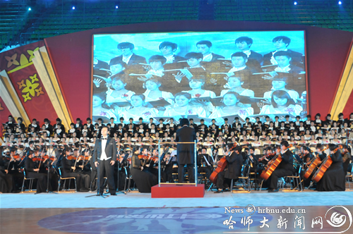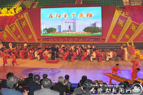 晚7时30分,装扮一新的体育馆内,灯光璀璨,花团锦簇,舞台中央巨大的LED电子屏幕显示着晚会的主题“在阳光下飞翔”。观众席上嘉宾云集,高朋满座,会场气氛喜庆热烈。晚会在体现民族特色的《龙腾狮舞》节目中拉开了帷幕。晚会共分为“国乐飘香”、“师苑风采”、“中华武魂”、“乐坛芳华”等篇章。我校教师王慧颖、丁宁、曲冬梅分别演唱了歌曲《一杯美酒》、《大地飞歌》、《五星之梦》;来自基础教育学院的学生表演了情景歌舞《恰同学少年》;国际文化交流学院外国留学生演唱了歌曲《红旗飘飘》;艺术学校学生表演了《鼓舞龙江》;体育科学学院学生进行了健美操和武术表演;音乐学院话剧团舞蹈团表演了舞蹈《文韵•诗乐舞印象》,展示了我校师生昂扬向上、健康快乐的精神风貌。校友汤俊、王忠艳分别演唱了歌曲《母亲》、《我的深情为你守候》,校友金丽演奏了小提琴独奏《梁祝》,表达对母校的感激和祝福。晚会现场,在地理科学学院学生的操作下,曾在2010年第十届全国机器人大赛中获得类人型机器人举重比赛桂冠的机器人也进行了表演,将晚会气氛推向了高潮。晚会在音乐学院合唱团演唱、交响乐团演奏的《白山黑水》选曲中圆满落幕。