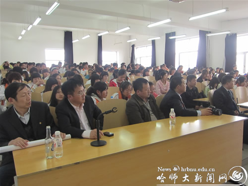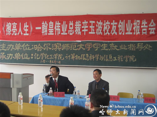 辛玉波总裁自豪地以一句“我是中国首席擦鞋匠”拉开了本次报告会的序幕。他主要讲述了自己十多年来的创业历程——从原伊春市新青木材加工厂职工培训学校校长到1992年辞职从事个体经营,再到1999年离开家乡来到哈尔滨创业,然后成功组建了翰皇伟业集团。这十多年的阅历让他有极大的感触:学会放弃,他辞职不当校长;学会弯腰,促使了他为别人擦第一双鞋;学会挑战,他逐步将品牌向奢侈品牌延伸并遍及全球。谈到女儿,他脸上洋溢着幸福的笑容;谈到创业的艰辛,他不会将苦难作为绊脚石,而是将其视为一种宝贵的财富。他强调,创业是与心理有密切联系的,要保持积极乐观向上的精神。同时他不时与与会学生进行互动,幽默的言语让在场的每一位听众对其多彩的人生感到深深的折服。