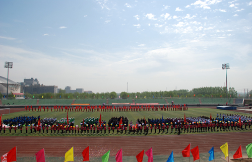 在雄壮的《运动员进行曲》中,以国旗护卫队为先导,刀旗队、气球队以及各代表队身着整齐的服装,喊着嘹亮的口号,迈着矫健的步伐,精神抖擞地依次入场,接受与会领导的检阅。