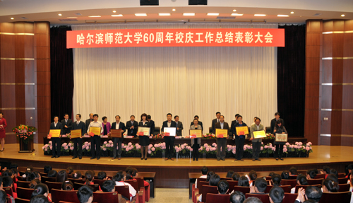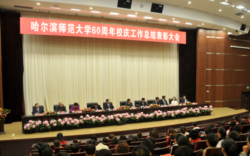会上,校党委书记作重要讲话。他指出六十年校庆是我校发展史上的一个重要里程碑。通过校庆,我们总结了哈师大六十年的奋斗历程,凝炼了哈师大精神,凝聚了全校人心,鼓舞了斗志,提高了学校的社会声誉,进一步坚定了我们建设强校和高水平大学的信心和决心。他强调,追求卓越、勇于创新、吃苦耐劳、无私奉献、团结爱校、顾全大局的校庆精神是我们通过六十年校庆收获的最大一笔精神财富和无形资产,我们要努力弘扬校庆工作中体现出的精神风貌,把学校发展改革各项事业继续推向前进,以奋发有为的精神状态,努力进取,扎实工作,开创学校新的辉煌!