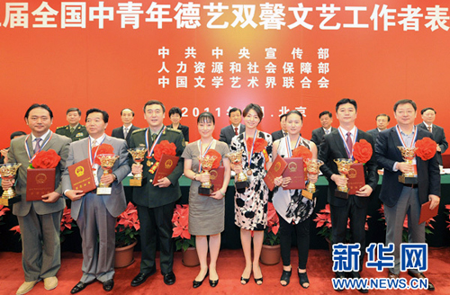 6月20日中共中央宣传部、人力资源和社会保障部、中国文联在北京人民大会堂举行第三届全国中青年德艺双馨文艺工作者评选表彰大会,54位来自全国各地的戏剧、电影、电视、音乐等门类的文艺工作者受到表彰,我校音乐学院陶亚兵教授荣列其中,被授予“全国中青年德艺双馨文艺工作者” 荣誉称号。同时获此殊荣的还有吕继宏、任军(大兵)、李幼斌、辛丽丽、张也、宋飞、张凯丽、张继刚、陈国星、陈寒柏、岳红、倪萍、董卿等艺术家。中共中央政治局委员、中央书记处书记、中宣部部长刘云山20日出席了表彰大会并讲话,他强调广大文艺工作者要始终坚持社会主义先进文化前进方向,在推动伟大事业的历史进程中积极进行文化创新创造,在服务人民群众的艺术实践中倾情奉献自己的聪明才智,努力做崇德尚艺、德艺双馨的社会主义文化建设者。