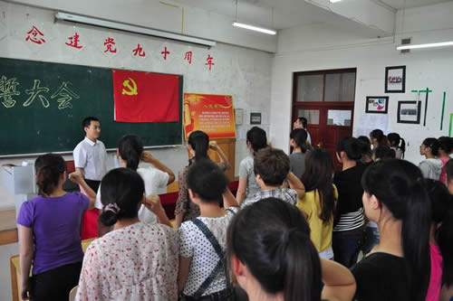 (100工作室记者郑杰/文)在中国共产党九十华诞之际,为热烈庆祝党的生日,歌颂我党九十年来的光辉历程,进一步激励学生坚定理想与信念,加强对学生的思想政治教育工作,6月28日下午,政法学院在社科楼502室召开纪念建党九十周年暨入党宣誓大会。政法学院党委书记苗正达、副院长李斌、团委老师以及学生党员、预备党员、积极分子参加了此次大会。