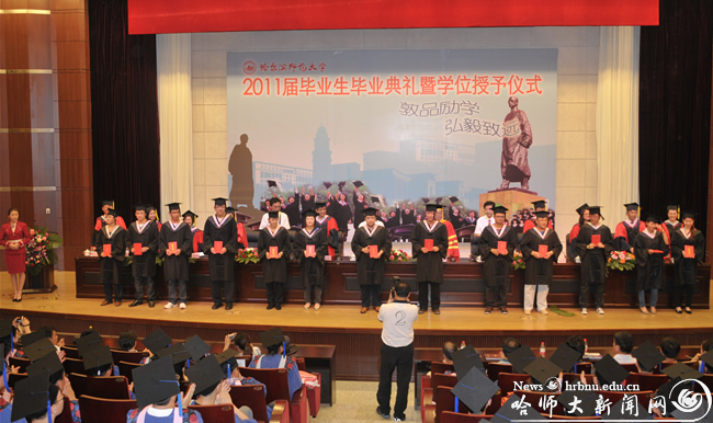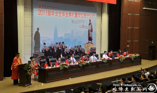 仪式上徐晓风、臧淑英分别宣布了2011届本、专科毕业生名单和博士、硕士研究生名单;王为正、王广明分别宣布了获得黑龙江省2011届优秀本专科毕业生名单和优秀硕士毕业生名单。我校2011届博士毕业生共计21人,硕士毕业生共计726人,本、专科毕业生总计10275人;共有23名毕业生获得2011年省优秀硕士毕业生称号,有284名毕业生获得省优秀本专科毕业生称号。伴随着欢快而喜庆的乐曲,学校领导为获得学位的毕业生授予学位,为获得奖励的毕业生颁发荣誉证书,全场报以热烈的掌声。
