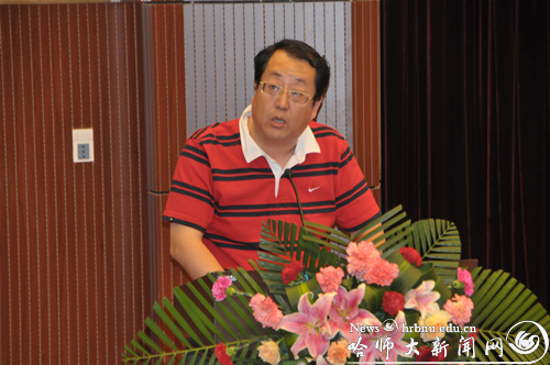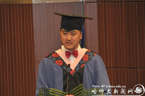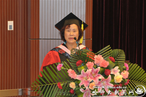 文学院博士生导师冯毓云在仪式上代表全体教师发言,她认为作为一名真正的导师,不仅仅是传递知识的询导者,更为重要的应该是一位“用爱心播种希望”的耕纭者。“走进学子的心灵世界”,才能和学子们创造一个“尊重传统、追求真理、学术自由、独立思考和博爱”的多元教育的优良环境,才能造就如航天之父——钱学森大师所殷切期望的、所呼唤的“有创新性的杰出人才”。校友代表、94届中文系毕业生、黑龙江现代园丁奖得主、哈师大附属中学高级教师张苑勋在仪式上发言,他说母校将“敦品励学,弘毅致远”的人格精神,“学高为师,身正为范”的人生准则渗透到自己的生命之中,督促其在工作之中不懈地努力与奋斗。他勉励毕业生在学习和工作中要虚心学习,终身学习,不骄不馁,自勇进取,用不懈的努力来回报母校。研究生会主席任佳伟代表毕业生发言,他感谢母校和师长的培养,学校“敢为人先、争创一流、艰苦奋斗、求真务实、与时俱进、开拓创新”的优良传统和高贵品格将永远激励毕业生们不断进取、崇尚卓越、追求一流,并表示毕业生们将用自己的双手,为祖国谱写新的华章。