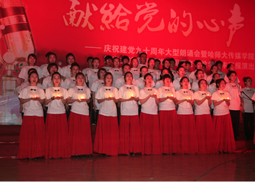 传媒学院十分重视培养学生的专业技能,大胆进行教学改革,这次活动不仅为学生搭建了一个展现才能的舞台,同时也是学校师生与专业播音员互动学习的绝佳机会,开创了校企合作新篇章。在建党九十周年来临之际,师生们用一腔热血倾诉出他们报效祖国、回报社会的强烈愿望;哈人民广播电台九位播音主持人用专业素养和师生们共同为中国共产党建党九十周年献上了最美好的祝愿。