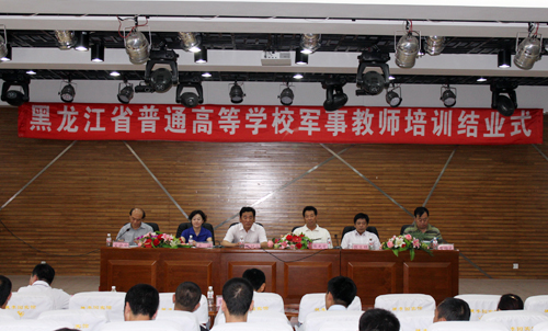 由我校承办为期一周的黑龙江省普通高校军事教师培训工作于7月2日上午在我校梦溪宾馆二楼会议厅胜利结束, 省教育厅体卫艺处处长焦光宇、省教育厅体卫艺处副处级调研员卢瑛、全国军事课教学指导委员会委员、黑龙江省军事课教学指导委员会主任委员张树华和省高校国防教育专业委员会理事长宋晓安、秘书长张立双以及我校武装部部长常维东和部分高校武装部部长参加了结业式。
