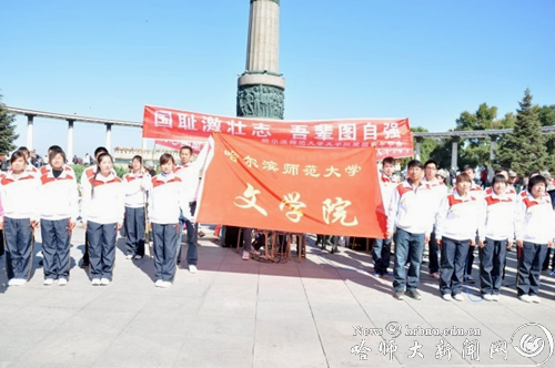9月18日上午,文学院爱国青年学会(原哈师大抗联精神宣传队)一行34人与黑龙江省东北抗联精神宣传队及多位抗联烈士后代在哈尔滨防洪纪念塔广场,为社会各界群众进行了主题为“纪念九一八事变80周年,我的家在东北松花江上”的文艺演出。