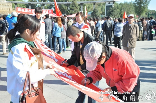 伴随着防空警报的拉响,纪念活动在9时18分准时开始。我校学生先后表演了《将军颂》、《神州大地花正红》等节目,并于演出结束后在中央大街举行了“纪念九一八”万人签名活动。新华网、凤凰网、黑龙江新闻网等诸多媒体都对此次纪念活动进行了报道。