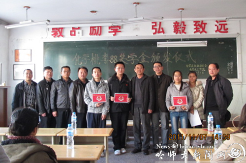 11月7日下午,正值收获累累硕果的金秋之际,原化学系88级校友代表来到基础教育学院化学教育专业一年级学生教室,为2010级化学教育专业学习成绩优异的唐世霖、孙建焜、綦纤纤三名同学,颁发“化学桃李88”奖学金获奖证书和奖金。化学化工学院党委书记王晓光、学生工作处副处长王彦庆出席奖学金颁发仪式,并为获奖学生颁发证书和奖金,2011级化学教育专业全体学生参加了颁发仪式,仪式由材料化学系主任李刚主持。