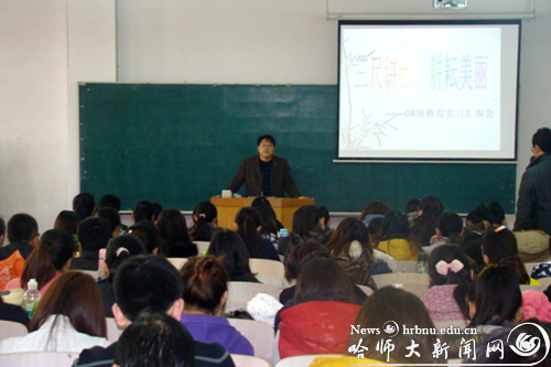 杨超首先代表学院对此次教育实习工作进行了总结,肯定了同学们的实习成绩,指出了实习中存在的问题,勉励同学们以教育实习为起点,发奋学习,进一步提高自身的知识储备和专业技能。苏继红宣读了2008级校优秀实习生名单,2008级许少杰等多名同学进行了实习成果展示。