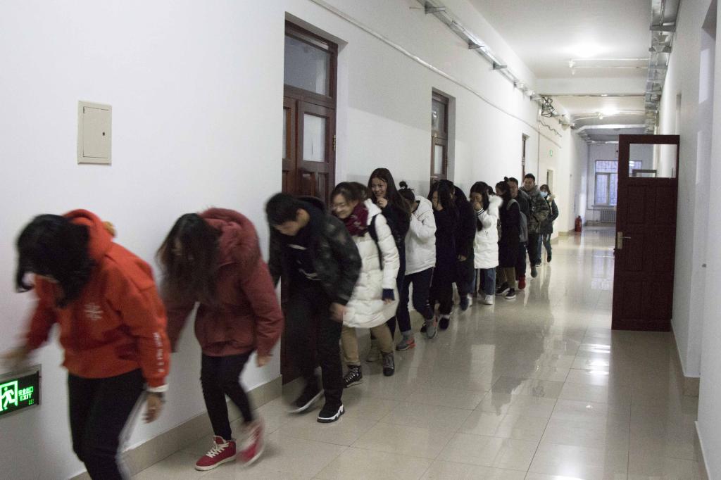 随后,张弘强教官带领同学们进行了火灾事故应急疏散演练。在老师及教官的带领下,同学们按照应急预案的撤离顺序,依次有序地转移到安全场地。