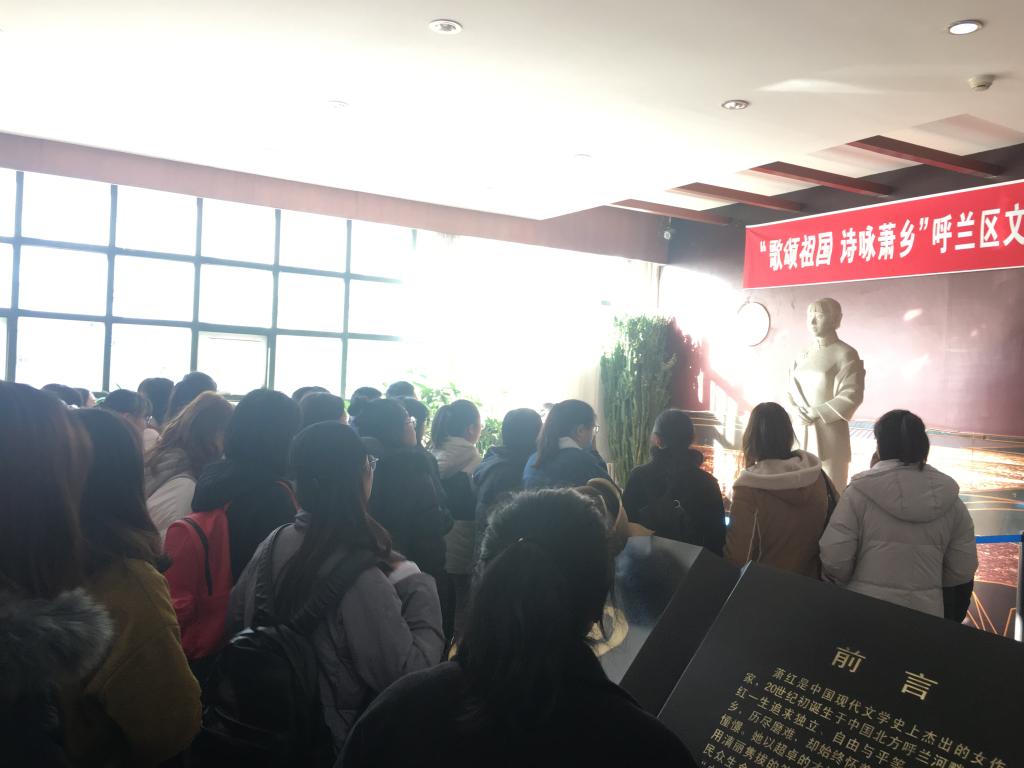 在萧红纪念馆,钉刻在墙上的一张张笔稿、一幅幅画卷不知不觉地将老师与同学们的思路带入了那些经年影像之中,在感叹着她短暂而坎坷的一生的同时,又被那些劲透纸背的光芒所折服。在萧红故居,同学们在讲解员的讲解下进一步探索萧红的成长环境。一座两米高的汉白玉萧红塑像。院内五间正房,在这个清雅质朴的院落中大家追寻着一代才女成长的足迹,青砖瓦房里,仿佛还能重现她儿时生活的光景。“我将与蓝天碧水永处,留得那半部‘红楼’给别人写了,半生遭尽白眼,身先死,不甘,不甘。”萧红半生漂泊,意志不改,曾创作多篇抗日主题作品,对推动人民抗战起到了不可磨灭的作用。