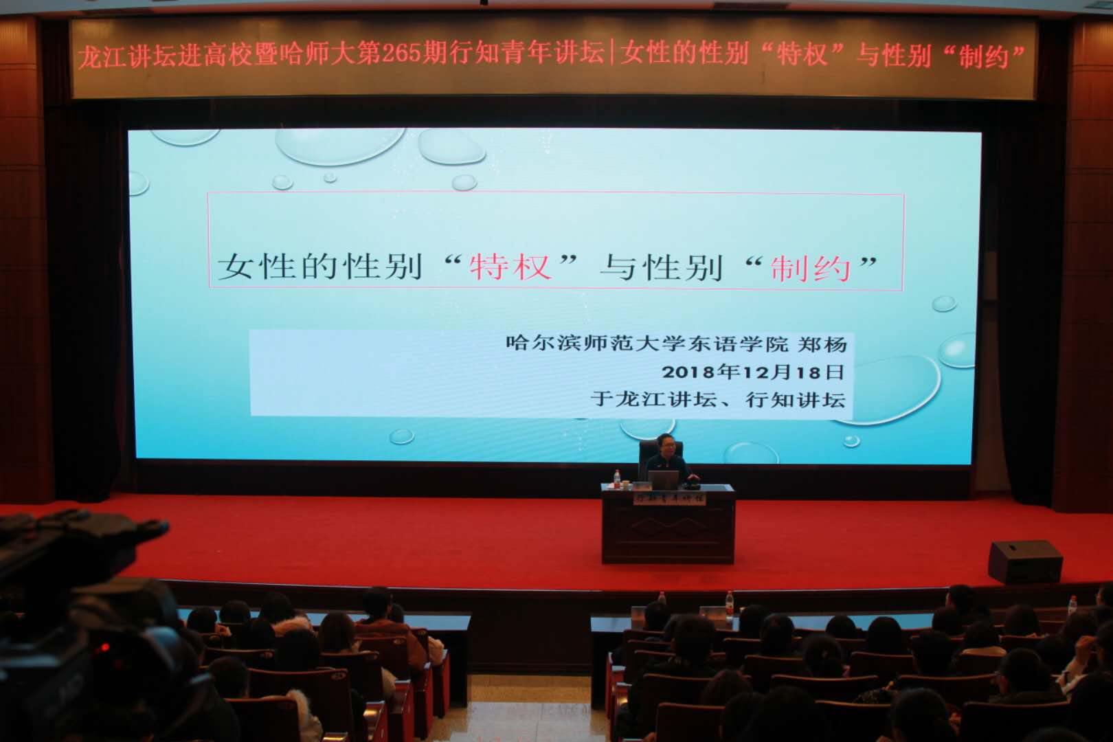 (刘强/文)12月18日晚,我校东语学院副教授、副院长、硕士生导师郑杨应邀做客我校第265期行知青年讲坛,本期讲座以“女性的性别‘特权’与‘性别’制约”为题。科学会堂二楼座无虚席。