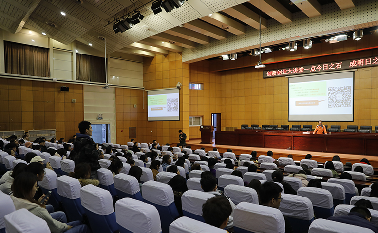 刘玉教授首先以自己创建的Dian团队的人才孵化模式为例,诠释本科生在校期间如何培养创新思维、开展有实效的创新创业活动。通过刘玉教授的精彩演讲,同学们深刻认识到从创新到创业是水到渠成的积累和演进,只有做到量的积累才能达到质的飞跃,同时还要脚踏实地注重实践,实践是创新的不竭源泉。