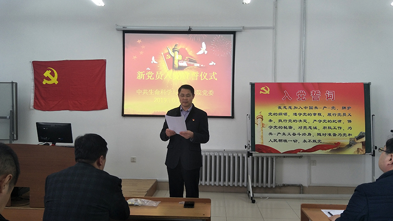 学院党委书记于占福以一名34年党龄的老党员身份为大家讲党课。他指出,学院党委隆重举行新党员入党宣誓仪式本身就体现出党组织的关心、厚爱、期望和要求。今天我们在组织形式上入党了,但更重要的是在思想上入党,牢记共产党员的初心和使命,使自己成为一名真正合格的、优秀的共产党党员。他勉励大家,一要坚定党的理想信念。在思想上不断加强党性修养和锻炼,努力改造主观世界,坚定共产党员的理想信念,时刻牢记党的宗旨是全心全意为人民服务,热爱党、热爱祖国、热爱人民,树立正确的世界观、人生观、价值观,落实在实际行动上要坚定不移站稳党的政治立场,增强“四个意识”,坚定“四个自信”,坚决做到“两个维护”。二要不断加强学习,增强本领。积极参加党的组织生活,坚持“两学一做”常态化制度化,学习党史、党的政治理论路线方针政策,用习近平新时代中国特色社会主义思想武装头脑,向群众宣传党的宗旨和主张。刻苦学习专业知识,增长才干和本领,努力培养锻炼自己成为德智体美劳全面发展的社会主义合格建设者和可靠接班人。三要发挥表率作用,做遵纪守法的模范。牢记党员意识,严格遵守党纪法律法规和校纪规章,时时事事处处发挥党员的先锋模范作用,带动身边同学积极向上,不做与党员身份不符的事情,日常注重加强个人思想品德修养,学会做人做事更是对党员的基本要求。要努力培养廉洁意识,增强拒腐防变的能力,永葆党的纯洁性、先进性和战斗性。