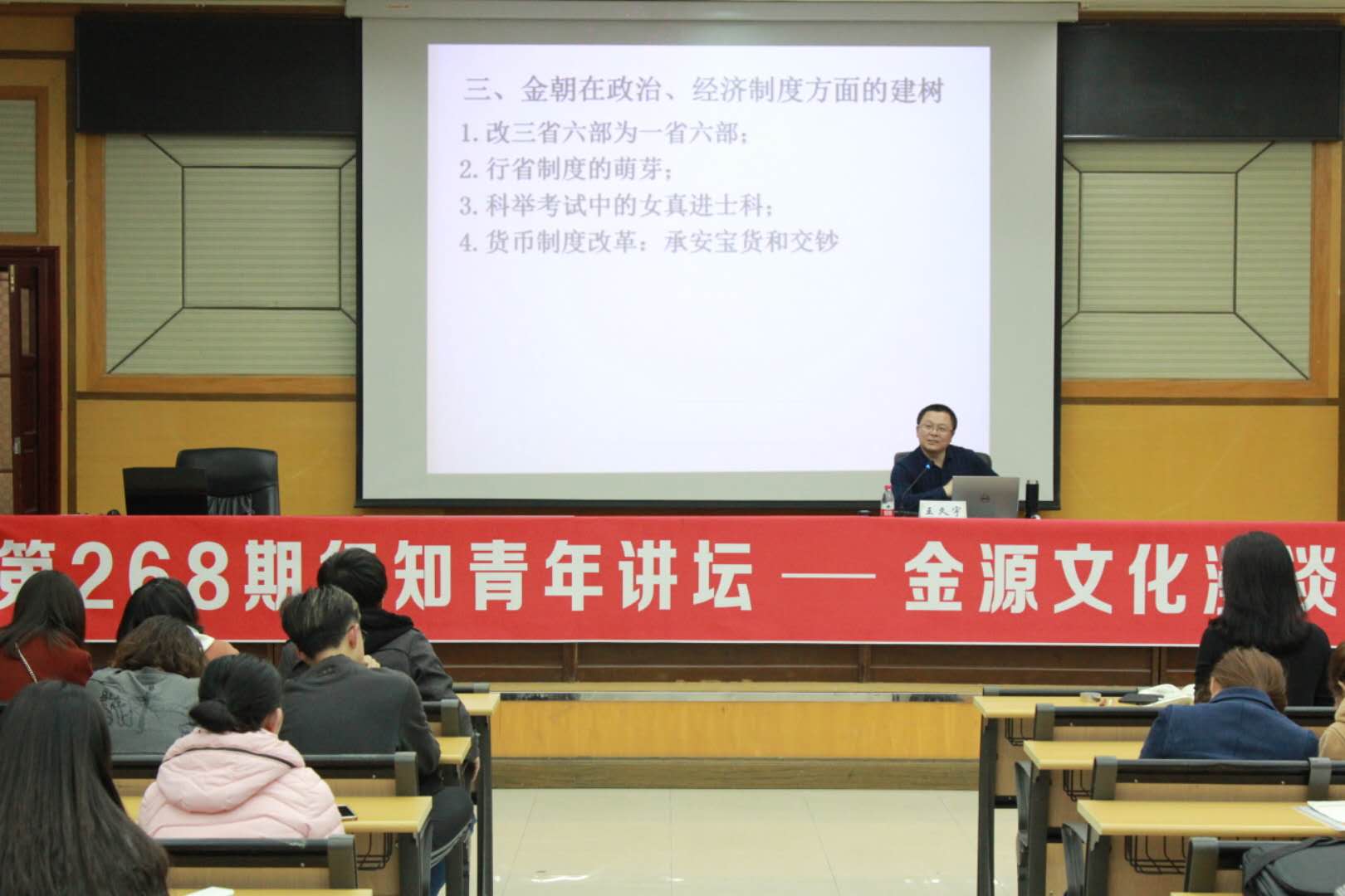 (刘知凝/文)4月1日晚,我校历史文化学院副教授、硕士研究生导师,中国辽金契丹女真史学会会员王久宇应邀做客我校第268期行知青年讲坛,讲座以“金源文化漫谈”为主题,为现场观众带来了一场丰富的学术盛宴。