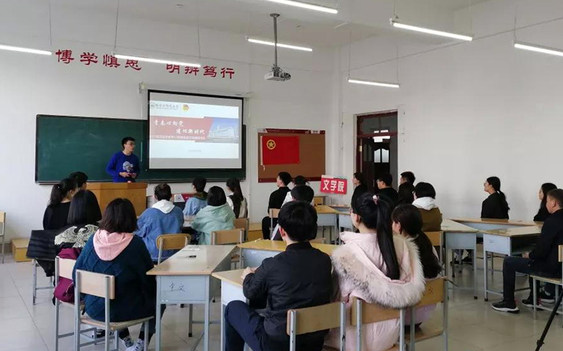 (刘国英/文)近日,文学院团委号召所属74个团支部开展“青春心向党 建功新时代”主题团日活动。经过学院评比,文学院2017级汉语言文学专业12班团支部脱颖而出。4月3日,文学院进行了示范性主题团日活动。校团委副书记王若虎,文学院党委副书记魏衍军受邀参加了本次主题团日活动。