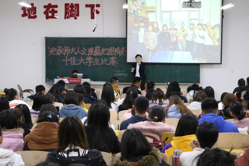 12月2日,为加强学院的学风建设,激发学生开拓创新的热情,深入挖掘大学生先进典型,发挥先进典型的示范引领作用。地理科学学院于理工三号楼220室举行“地承师大人文,理蕴地理精英”十佳大学生比赛。