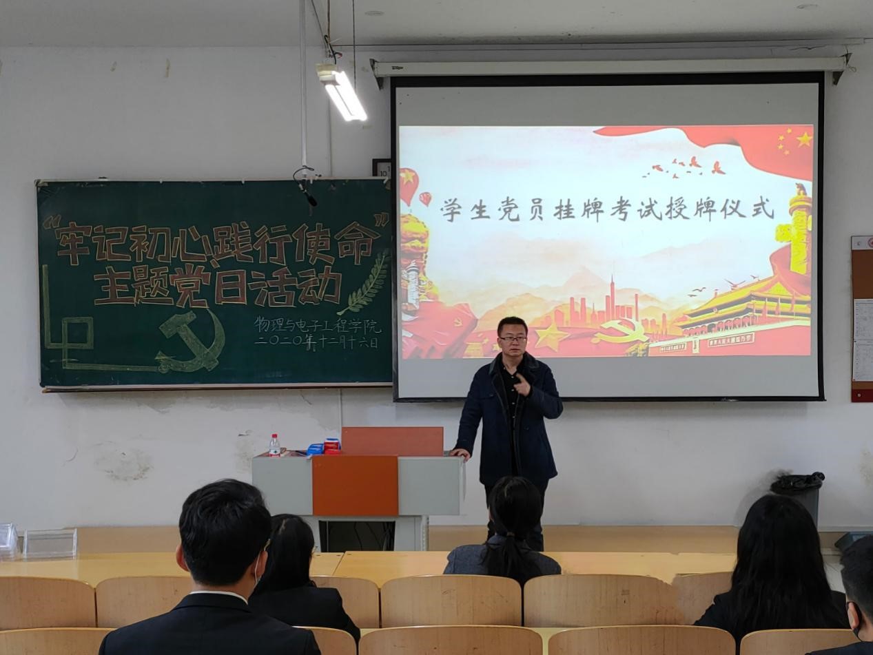 (李信洁/文)为激发学生党员的荣誉感、责任感和使命感,充分发挥党员先锋模范作用,12月16日下午,物理与电子工程学院在理工二号楼211室举办“牢记初心,践行使命”主题党日活动。学院院长李林、党委副书记姜雪娥、物理与电子工程学院全体辅导员以及学生党员参加了本次活动。