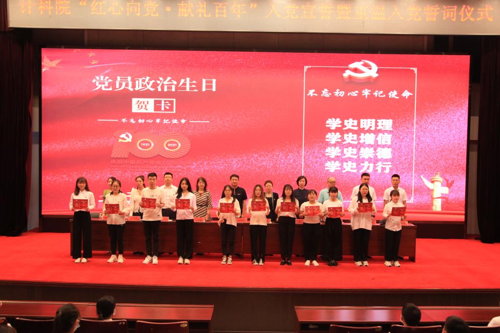 (孙禹/文)为庆祝中国共产党成立100周年,深化党史学习教育,激励党员切实增强荣誉感、责任感、归属感,坚守初心、勇担使命,计算机科学与信息工程学院党委于6月23日下午在科学会堂举行了“红心向党 献礼百年”新党员入党宣示暨老党员重温入党誓词活动。学院领导班子全体成员、党支部书记及全体学生党员参会,学院党委副书记任伟主持。