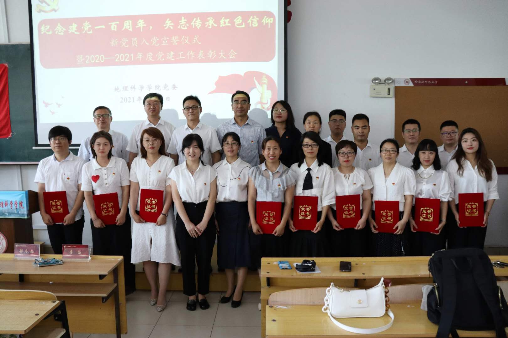 为庆祝中国共产党成立100周年,重温党的光辉历程,缅怀党的丰功伟绩,进一步激发广大党员的使命感、责任感和光荣感,激励新党员积极投身于党史学习教育中,通过学史明理、学识增信、学史崇德、学史力行,充分发挥好党员引领示范作用,成为党和国家建设伟大事业的中流砥柱,成为学校、学院改革、建设、发展和各项工作的排头兵、火车头。地理科学学院党委于2021年6月30日在理工三220室举行“庆祝建党一百周年,矢志传承红色信仰——新党员入党宣誓仪式暨2020-2021年度党建工作表彰大会”。地理科学学院党委书记蒙国军、院长张冬有、副院长吴相利、副院长李苗以及2020—2021年度党建工作中涌现的先进个人、全体教师党员、2021年上半年新接收预备党员与部分学生党员代表出席本次会议,本次大会由团委书记陈莹莹主持。