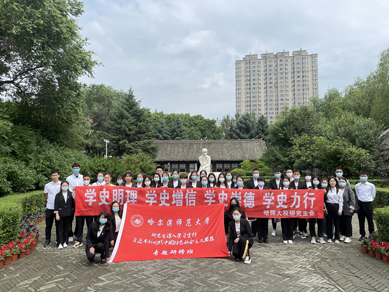 (刘思佳、张锐、韩童/文)在喜迎中国共产党建党100周年之际,为深入贯彻习近平总书记在党史学习教育动员大会上的重要讲话精神,加强爱国主义教育,深挖本地红色资源,传承红色基因,创新学习教育形式,将党史学习教育与校园文化活动有机结合,教育引导广大研究生坚定不移跟党走,2021年6月30日上午,我校研究生深入学习宣传习近平新时代中国特色社会主义思想研修班(第四期)学员代表和研究生会主要干部共同赴萧红纪念馆与萧红故居参观学习。
