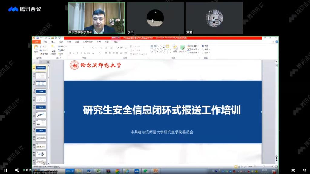 为贯彻落实学校2022年工作要点,深入推进“112349”思想政治教育模式探索,强化安全信息闭环式报送机制,4月1日晚19点,研究生学院举行了安全信息闭环式报送工作线上培训会议,研究生学院党委书记李贵彬担任主讲,全校研究生安全信息员785人参加培训。